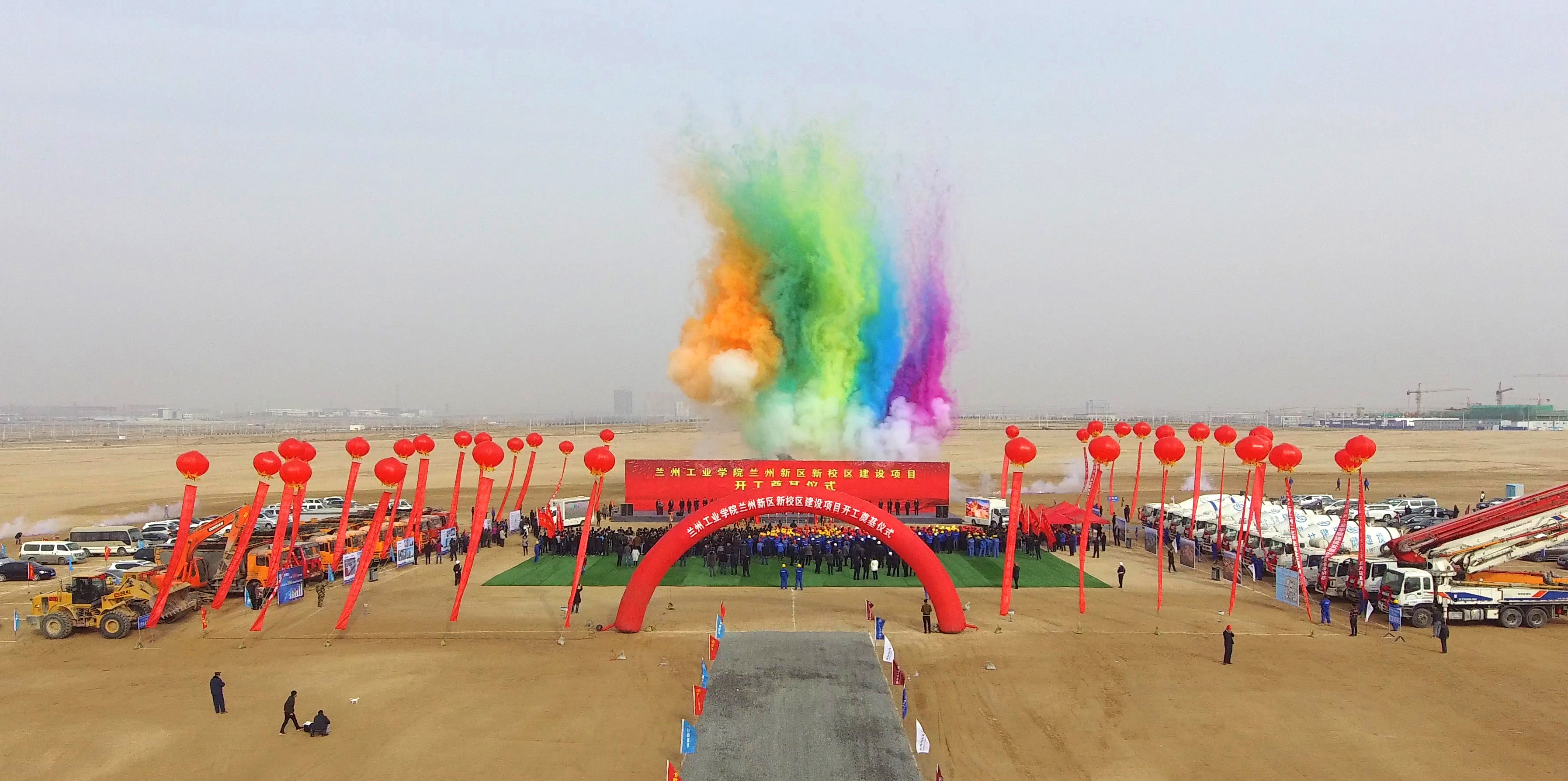 随后,伴随着热烈的礼炮声与缤纷绽放的礼花,与会领导与嘉宾为兰州工业学院兰州新区新校区项目培土奠基。