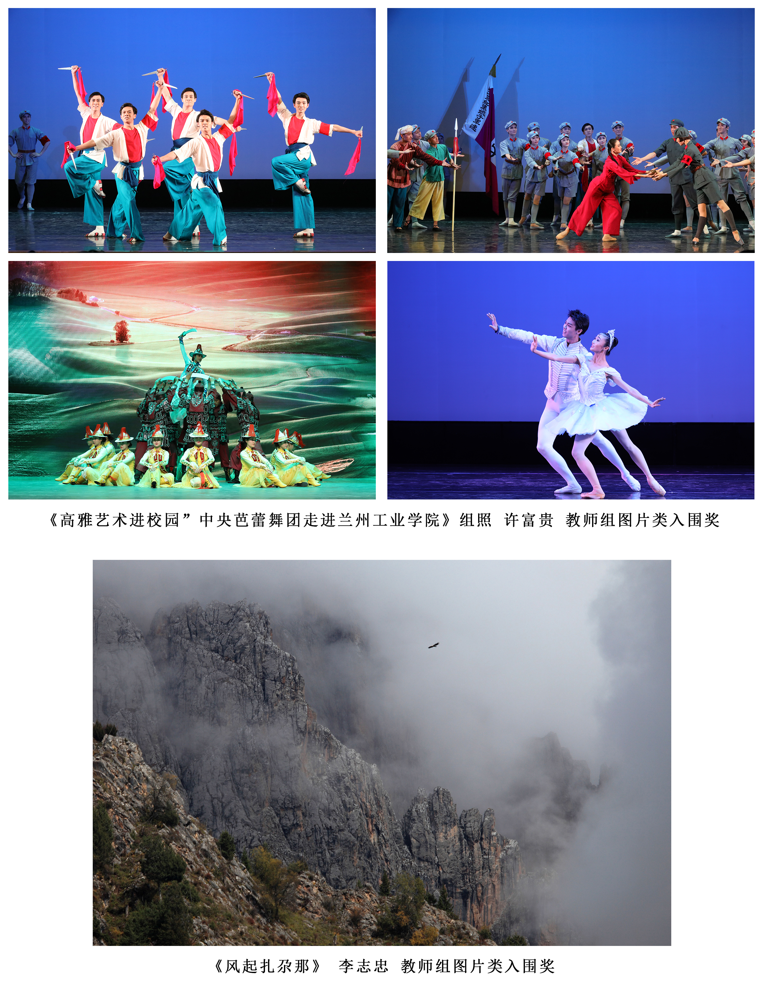 近日,由甘肃省教育厅主办,河西学院、甘肃省摄影家协会承办,甘肃青年摄影家协会、小米甘肃分公司协办的甘肃省第三届大学生摄影展成果揭晓,我校学生刘宇晖的作品《入夜兰州》获得学生组图片类一等奖;郭倩的作品《问天胜景》、冯文杰的作品《家乡夜景》获得学生组图片类优秀奖,另有11位学生作品获得入围奖;教师杨伟的作品《微观生态作品》、龚延恒的作品《当代青年人肖像》获得教师组图片类二等奖;李志忠的作品《风起扎尕那》、许富贵的作品《“高雅艺术进校园”中央芭蕾舞团走进兰州工业学院》获得教师组图片类入围奖。