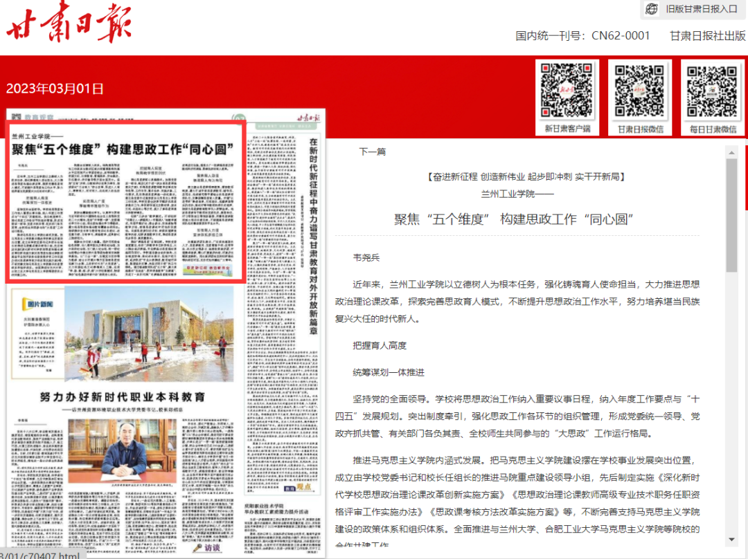 2019年3月18日,习近平总书记主持召开学校思想政治理论课教师座谈会,并发表重要讲话。兰州工业学院认真贯彻落实习近平总书记重要讲话精神,坚持不懈用习近平新时代中国特色社会主义思想铸魂育人,围绕“培养什么人、怎样培养人、为谁培养人”这个根本问题,构建新模式、培育新队伍、积累新经验,取得了明显成效。在习近平总书记“3.18”重要讲话发表四周年来临之际,《甘肃日报》刊发我校党委书记韦尧兵《兰州工业学院:聚焦“五个维度” 构建思政工作“同心圆”》的署名文章,介绍我校构建“大思政”工作格局的情况。